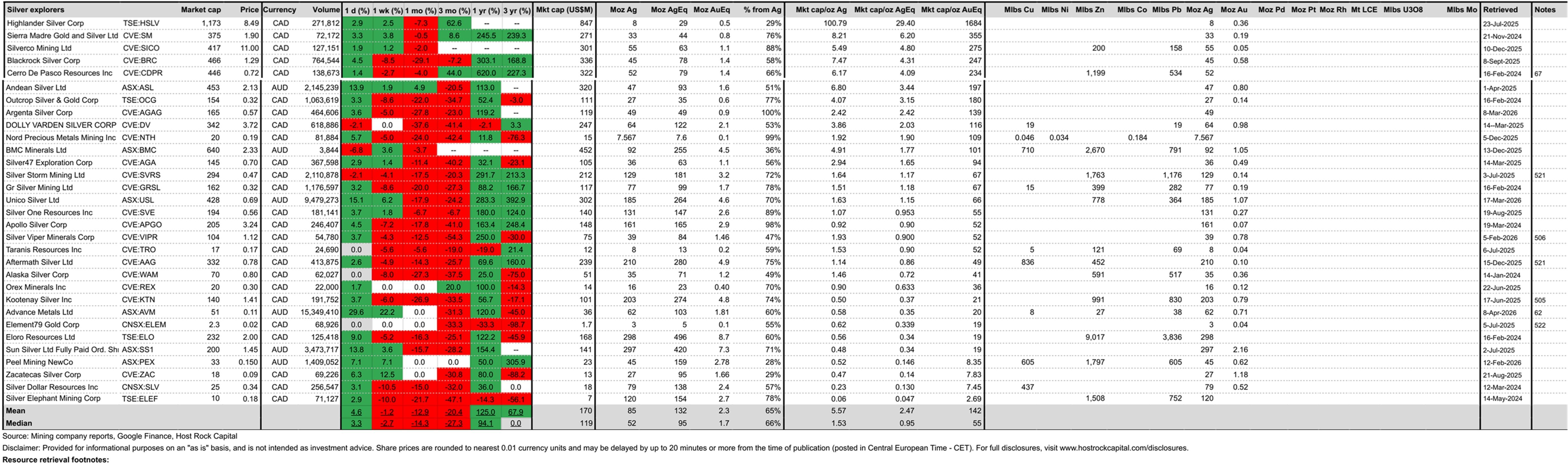 Silver explorer Advance Metals (ASX:AVM) announced today (8 Apr) an initial JORC resource estimate for its Yoquivo silver (and gold) project in Mexico, which grew the project’s contained silver-equivalent ounces by a reported +92% (compared to the prior foreign/historic estimate) to 33 Moz AgEq @ 120 g/t AgEq. And including the company’s other (historic/foreign) resources in Mexico (Gavilanes and Guadalupe y Calvo), this announcement grew the company’s overall resource inventory by +17.5% to 103 Moz AgEq (1.81 Moz AuEq), which are now 60% from Ag and 39% from Au (rest Cu-Zn-Pb) at our estimated 3-month trailing average metal prices with no recovery factors. This helped AVM stock gain a WHOPPING +30% today (8 Apr) to 11c/sh, market cap A$51m, and market cap/oz resource US$0.35/oz AgEq ($20/oz AuEq) - which is STILL a HUGE 63% discount to our 31-company silver explorer group median US$0.95/oz AgEq ($55/oz AuEq).