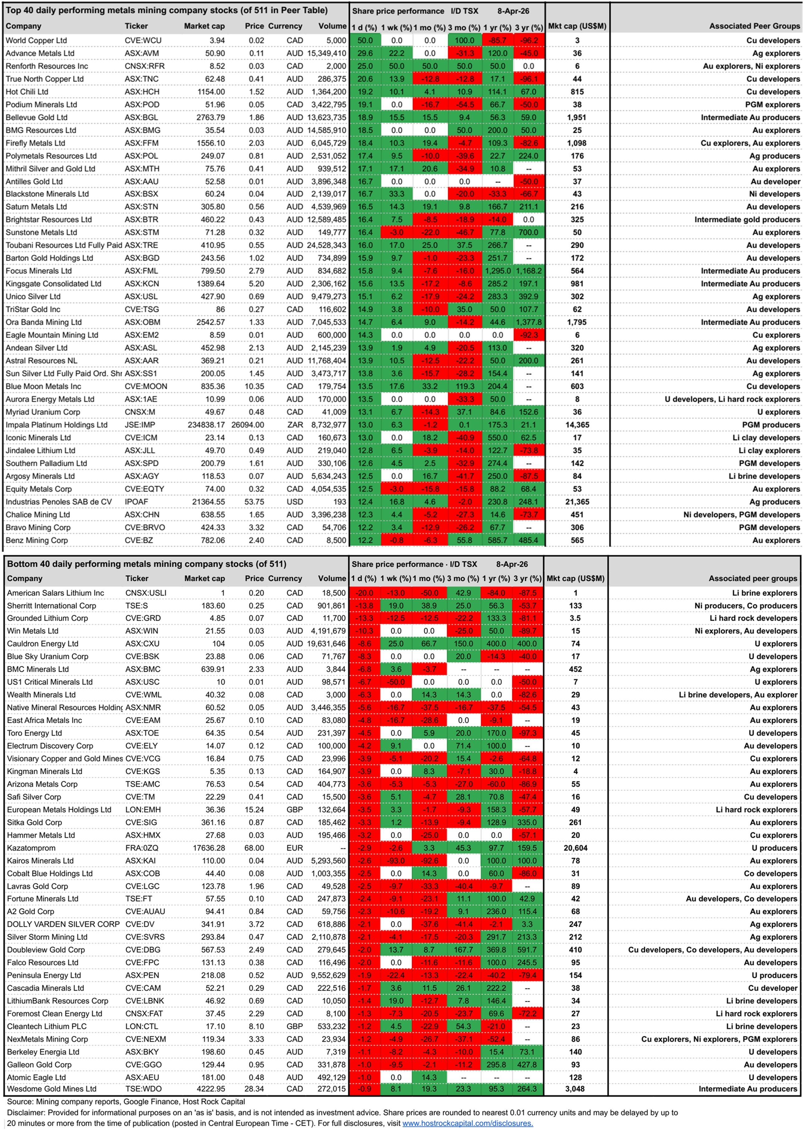 Top and bottom 40 daily performing metals mining company stocks (out of 511 in our Peer Table) intraday TSX/NY (including earlier ASX movements):