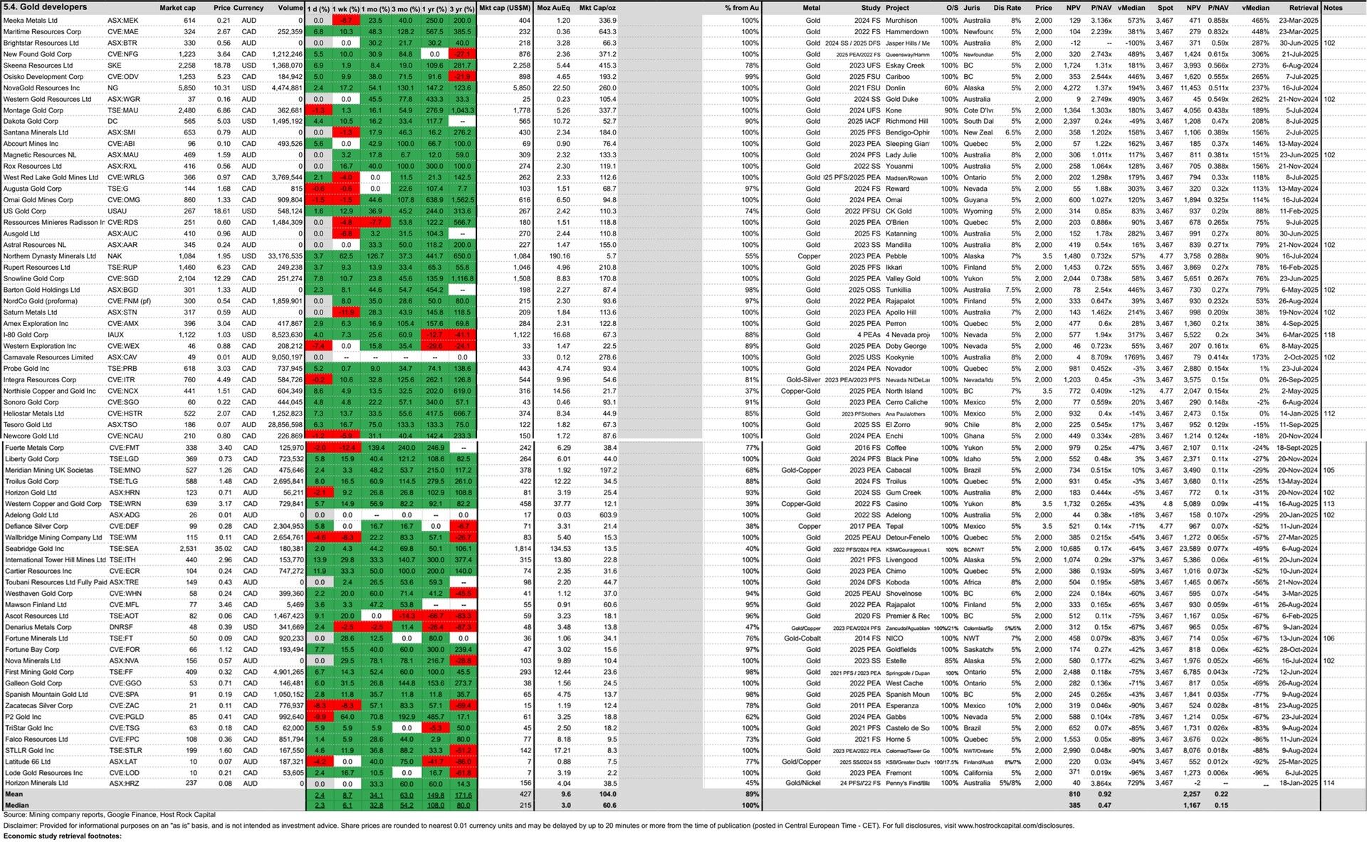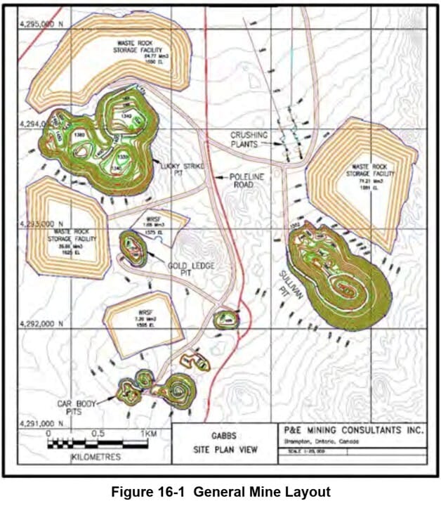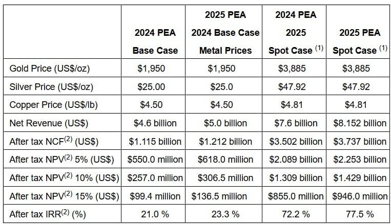 7 Oct 2025 - Gold developer P2 Gold (TSXV:PGLD) announced an updated PEA for its 100%-owned Gabbs gold-copper project in Nevada along its prolific Walker’s Lane trend. The press release quite clearly and transparently states everything is the same as the 2024 PEA (9mtpa oxide heap leach + SART + ADR operation for 5 years, before adding a 4mtpa mill in year 6 for sulfides, at which time oxide heap leach decreases to 5 mpta, for constant 9 mpta in total), except for the heap leach recoveries, which increased to 85% (from 78%) for gold, to 67% (from 54%) for copper, and to 60% (from 45%) for the trace silver, as a result of the phase 3 met test work (see news release dated 11 Aug 2025) which used more cyanide. These subtantial increases to heap leach recoveries translated to a slight improvement in economics compared to the 2024 PEA, despite capex and opex both increasing slightly. Reported post-tax NPV at reported spot of $3,885/oz was US$2.25b (up 8% from $2.1b in last study) from initial capex of US$383m. HOWEVER, the mine plan in the 2024 had been preliminary, and states that waste rock storage facilities had not been designed in detail. FURTHERMORE, after a closer look at the 2024 PEA in an attempt to gage the additional pond area that would be required for the additional cyanide degredation, and the additional leach pad liner requirements for the higher cyanide concentration, we discovered that not only did the 2024 PEA omit costs and space for ponds, it did not not account for ANY leach pads, NOR did it account for the aformentioned dry stack tailings impoundment with conveyor belts. So while the folks at Kappes, Cassiday & Associates had improved the metal recoveries in the phase 3 test work in this PEA they prepared, the mine plan and infrastructure that had been prepared and provided by P&E Mining Consultants Inc. was not synced/updated (after it had already glossed over a number of key items making it quite light on capex). So this PEA’s reported initial capex of $383m can be expected to rise in future more refined studies. Heap Leach capex from the Golder Associates’ 2011 PEA for the Cerro Jumil project in Mexico (now called Esperanza gold project held by Zacatecas Silver TSXV:ZAC) was ~15-17% of initial capex. So perhaps leach pads will add some ~$70m in capex at Gabbs, and maybe tailings filter and additional ponds/liners will add another ~$50m (ball park), for a more realistic capex of $503m (~30% higher) that might be expected in a PFS / next study….which is inconsequential in the grand scheme relative to NPV of $2.25b (TOUCHE / GOOD SKATING!). PGLD trades at 41c/sh, market cap C$85m, and P/NAV (market cap/study NPV) of 0.10x at our reference gold price of US$2,000/oz - a 78% discount to our 69-company gold explorer peer group.
